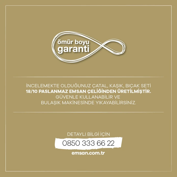 Çeliğin en şık formunu sofralarınıza Emsan kalitesinde taşıyan paslanmaz çatal, kaşık, bıçak seti.